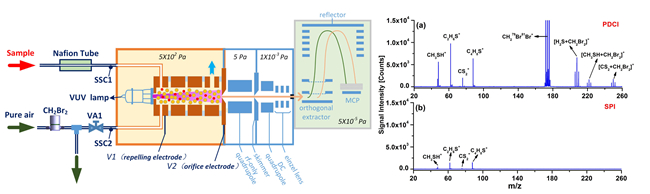 該研究團隊利用真空紫外燈(VUV)電離高濃度二溴甲烷試劑氣體獲得足夠多且強度穩定的CH2Br2+試劑離子,CH2Br2+試劑離子進一步與VSCs樣品發生高效的電荷轉移及離子加和反應,實現VSCs的高靈敏檢測。實驗結果表明:該離子化源對硫化氫、甲硫醇、二甲基硫等5種常見VSCs的檢測限均達到pptv量級,檢測時間小于1分鐘,此外特異性加和離子[M+CH2Br2]+的存在,增強了物質識別。