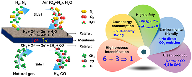 針對上述問題,該研究團隊創造性地提出了在混合導體透氧膜反應器中1步同時制備氨合成氣和液體燃料合成氣的概念,即:膜I側(side I)通入水蒸汽和空氣,膜II側(side II)通入天然氣(甲烷)。高溫下,膜I側空氣中的氧和水分解生成的氧通過透氧膜到達膜II側與甲烷反應生成液體燃料合成氣(H2/CO=2),同時膜I側流出氣體經冷凝干燥后即可得到氨合成氣(H2/N2=3)。結果表明,在膜反應器中,可以同時獲得18.8 mL cm-2 min-1的氨合成氣生成速率和45.6 mL cm-2 min-1的液體燃料合成氣生成速率,即:一個同時年產30萬噸氨和100萬噸甲醇的工廠,所需膜面積約7500m2,反應器體積僅為75m3,體現了高度的過程強化。此外,能耗比現有工業過程降低63%;膜反應器無飛溫和爆炸風險;環境友好,無直接CO2排放以及氨合成氣清潔,無有害氣體,如CO、H2S等。