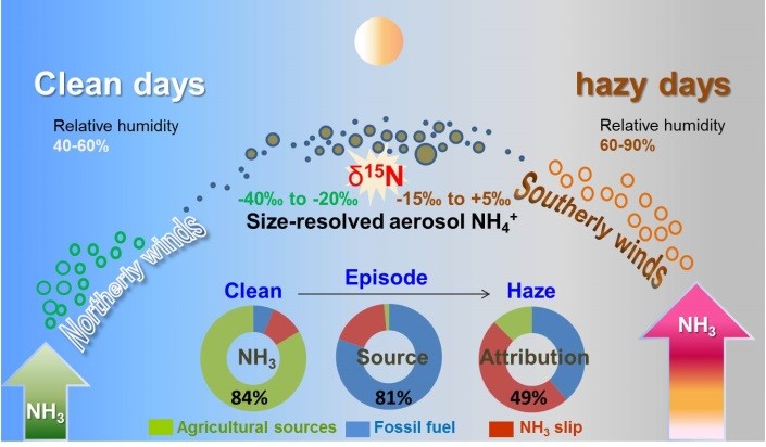近期,沈陽生態所穩定同位素生態學課題組方運霆研究員團隊與中科院大氣物理研究所潘月鵬博士、清華大學張強教授、美國普渡大學Greg Michalski教授等國內外科學家合作,通過對2013年北京市冬季典型灰霾期間大氣不同粒徑氣溶膠所含銨態氮15N自然豐度的測定,對城市大氣中氨氣來源進行區分。研究發現北京冬季重霾污染期間的氨氣中有90%來自化石燃料燃燒相關的排放,這直接證實了化石燃料燃燒對城市區域灰霾期間的氨氣具有極其重要的貢獻。