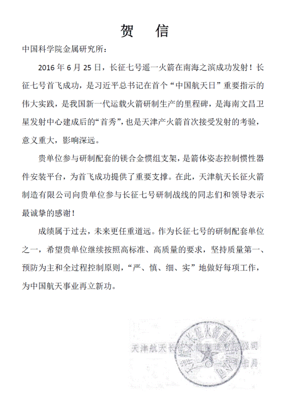 在產品研制過程中研究人員系統細致地研究和設計了鑄造工裝模具,澆注和補縮冒口系統,冷鐵,鑄造圓角和加強筋,型腔排氣孔布置方案,砂型阻燃劑,冶煉工藝方案,澆注保護和砂型型腔保護,防熱處理變形工藝、機械加工防變形工藝及專用工裝,表面處理工藝及工裝等。由于鎂合金鑄件的冶金質量對工藝參數高度敏感,為了精確控制每道工序的工藝參數,課題組制定了十九個工藝文件及十八個生產記錄文件來控制研制過程的工藝技術狀態。即使如此,每進行一步,研究人員都需現場確認工藝方案和工藝參數并親自動手實施。從工藝預研、初樣研制到試樣研制的三個階段共經過三次工藝方案論證,二次轉段工藝方案評審和論證,二次工藝歸零管理和論證,共進行了八十多次實驗,目前,已可以基本穩定獲得組織致密,化學成分、力學性能、尺寸精度、重量及表面防護均滿足設計要求的產品。2016年6月25日該部件隨長征七號在海南航天發射中心成功完成首飛任務,為我國新一代運載火箭發揮了重要技術支撐作用。日前,課題組收到用戶為此發來的賀信。