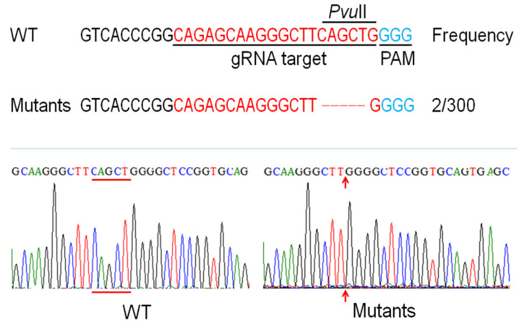 單細胞中心博士研究生王勤濤和路延篤博士等在海洋微擬球藻(Nannochloropsis oceanica)中,通過特定外源Cas9蛋白和指引RNA分子(guide RNA)的設計和共同表達,結合基于二代測序的高通量轉化株鑒定方法,實現了位于硝酸還原酶基因編碼序列的目標位點上五個堿基的精確刪除(見下圖),并篩選分離出與預測的表型與基因型均完全契合的基因組編輯突變藻株,從而在工業產油微藻中示范了基因組的精準編輯。