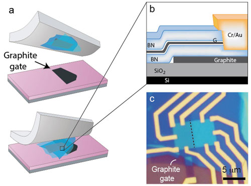 近十年來,世界各地科學家均開展了實驗觀測石墨烯中電子光學的研究工作。然而,該項實驗具有很大挑戰:1)電子不能有任何散射,全程須是彈道輸運;2)pn結界面需要有極小的粗糙度。前者的實現手段為人工堆垛方法,將石墨烯夾持在兩塊氮化硼之間,藉此隔雜質離散射源并提供原子級平整的基底(圖2)。對于后者,如果采用金屬門電極,即使利用當今最精密的電子束刻蝕納米制備也只能做到最小幾納米乃至十幾納米的粗糙度。哥倫比亞大學、金屬研究所等科研人員在實驗上提出了利用力學解理得到的原子級別長直邊界的厚度十幾納米的石墨作為門電極。從而解決了納米制備不能解決的極小粗糙度問題(圖2)。