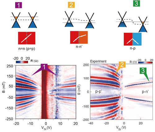 圖3, 不同摻雜下的pn結電子折射示意圖,與弱磁場下的磁聚焦得到的電子折射電壓曲線。
