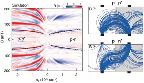 我們制備的pn結器件在液氦溫度下的電磁輸運測量表明,上述實驗挑戰得到滿足。通過局域的石墨門電壓和遠程硅片門電壓的調控,該型異質pn結能夠借助弱磁場下的磁聚焦手段測量得到高信噪比電子折射行為,首次得到了單位斜率的類光學電子正負折射。通過這項工作,我們間接地提取了電子在石墨烯pn結界面斜入射角度與透過率之間的聯系,通過與理論的比對,推算出我們制備的pn結寬度約為70nm。同時,模擬計算得到的結果與實驗數據高度吻合。該工作為電子光學實驗及其新型全電控電子開關等方面的應用與發展奠定了基礎。