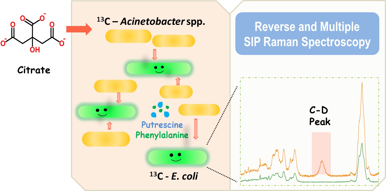 在此基礎(chǔ)上,研究人員構(gòu)建了由不動(dòng)桿菌(Acinetobacter spp.)與大腸桿菌(E. coli)組成的模擬菌群,它們是人體、醫(yī)院和自然界中均常見(jiàn)的機(jī)會(huì)致病菌,且其耐藥性日益嚴(yán)重,已引起臨床和微生物學(xué)者的關(guān)注。反向拉曼標(biāo)記技術(shù)結(jié)合“碳源-重水”雙標(biāo)記實(shí)驗(yàn)發(fā)現(xiàn),在檸檬酸作為唯一碳源的共培養(yǎng)體系中,不動(dòng)桿菌可快速利用檸檬酸,并展現(xiàn)了較高的綜合代謝活性。大腸桿菌“單身”時(shí)完全不能利用檸檬酸,但在與不動(dòng)桿菌“同居”時(shí)卻表現(xiàn)出了一定的綜合代謝活性。代謝物組分析表明,在雙方“同居”時(shí),不動(dòng)桿菌代謝檸檬酸的產(chǎn)物苯丙氨酸及腐胺可被大腸桿菌利用,含量雖不足以支撐后者的細(xì)胞分裂,但能保持其基礎(chǔ)水平的綜合代謝活性。因此該方法可在單細(xì)胞水平上解析與示蹤群落中細(xì)胞之間的代謝互作與共生關(guān)系。