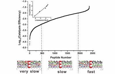 時,各個底物之間的相互競爭可以忽略不計,即在這種情況下可以簡單通過準一級動力學方程直接進行底物催化效率的準確計算。將這種方法與質譜技術相結合,實現在一次實驗中成功鑒定到2369個蛋白酶底物并準確得到相應的催化效率常數。
