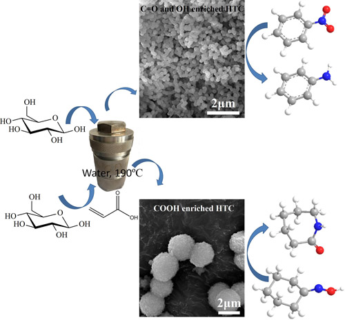 圖. 生物質(zhì)葡萄糖通過水熱碳化法制備出表面含氧基團富集的碳催化材料的示意圖。表面富集羰基和羥基的碳材料可有效地用于硝基苯還原反應,而表面富集羧基的碳材料可用于Beckmann重排反應。