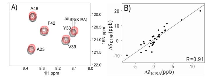 蛋白質的結構層次通常被分為一到四級。但是在細胞擁擠環境下,胞內其它大分子和目標蛋白質形成瞬態復合物,也被稱為蛋白質“五級結構”,而導致五級結構形成的作用力被稱為五級作用力(quinary interaction)。但是關于該作用力的研究難度大,相關報道很少。青島能源所仿真模擬團隊利用該團隊發展的核磁共振-遠程化學位移擾動方法(chemical shift perturbations,CSPs)(圖1)(J. Am. Chem. Soc. 2014, 136, 12816),研究了蛋白質在細胞裂解液環境下的五級作用力。