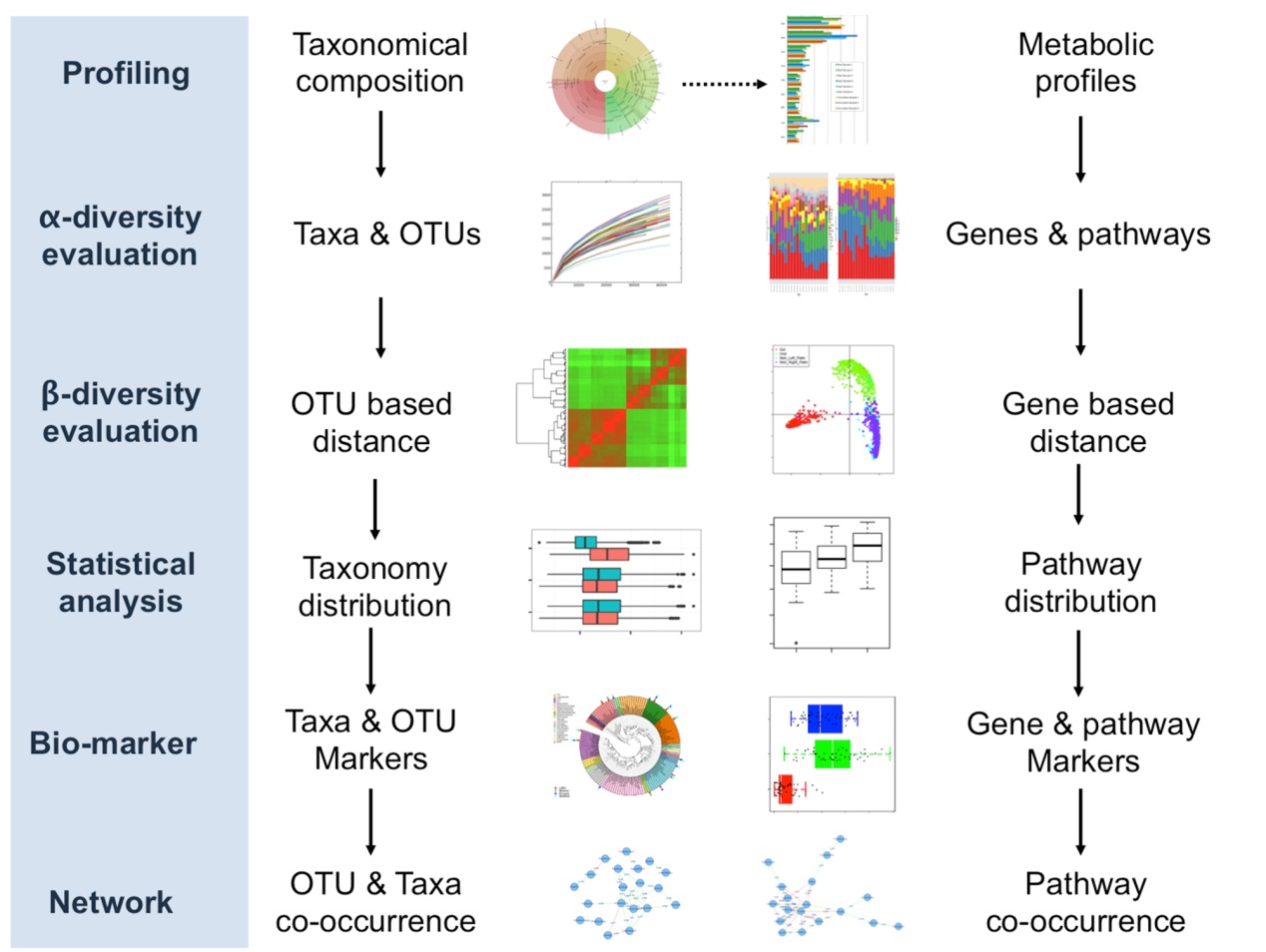 元基因組是當(dāng)前微生物組大數(shù)據(jù)最主要的存在形式之一。由于元基因組數(shù)據(jù)的復(fù)雜性、異質(zhì)性以及指數(shù)級(jí)增長(zhǎng)的體量,從中深度且快速發(fā)掘微生物群落結(jié)構(gòu)和功能上的變化規(guī)律,一直是業(yè)界的一個(gè)重要技術(shù)瓶頸。近日,青島能源所單細(xì)胞研究中心發(fā)表了元基因組高性能計(jì)算分析軟件Parallel-META 3,能夠深入、全面、快速地將數(shù)量龐大的未知微生物組進(jìn)行結(jié)構(gòu)與功能解析,從而剖析疾病或生態(tài)災(zāi)害下微生物組的變化規(guī)律(圖1)。