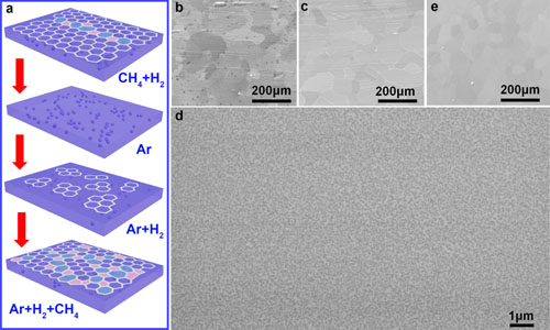 晶界是化學氣相沉積(CVD)方法制備的大面積石墨烯薄膜中普遍存在的缺陷。深入理解晶界對石墨烯的電學和熱學性質的影響對發展基于石墨烯的電子、光電和熱電器件具有重要意義。盡管目前對于單個晶界對石墨烯性質影響的研究較多,但宏觀尺度上晶粒尺寸對石墨烯電學和熱學性質的影響尚不清楚。其主要原因是基于傳統的析出(鎳基體)或表面吸附生長(銅基體)機制的CVD生長方法無法在大范圍內調控石墨烯的晶粒尺寸,制備晶粒尺寸小于電子和聲子平均自由程(約1微米)的小晶粒石墨烯尤為困難。