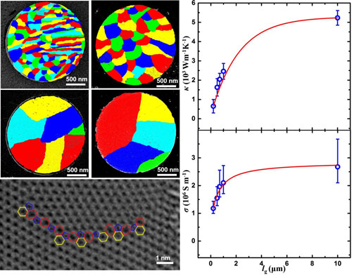 最近,金屬所沈陽材料科學國家(聯合)實驗室先進炭材料研究部石墨烯研究組采用溶碳量適中的金屬鉑片作為生長基體,發展出一種基于“析出-表面吸附生長”原理的CVD方法,僅通過改變析出溫度便實現了對石墨烯形核密度的控制,制備出晶粒尺寸在~200 納米到~1 微米范圍內均一可調、且晶界完美拼合的高質量單層多晶石墨烯薄膜。在此基礎上,獲得了晶粒尺寸對多晶石墨烯的電導率和熱導率的影響規律及晶界電阻率(~0.3 kW m)和晶界熱導(~3.8 109 Wm-2K-1),發現減小晶粒尺寸可導致熱導率的顯著降低但對電導率的影響較小。根據該影響規律推算,當石墨烯的晶粒尺寸從1毫米減小到5納米時,其熱導率的衰減幅度可達300倍,而電導率的衰減僅為10倍左右,并且熱導率和電導率隨晶粒尺寸變化的變化率高于典型的半導體熱電材料。
