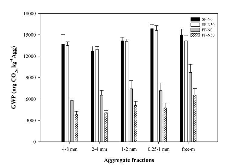 圖1兩樣地的各個團聚體粒徑的全球增溫潛勢在施氮處理下的差異(SF楊樺林,PF闊葉紅松林,N0為對照,N50為高氮施加)