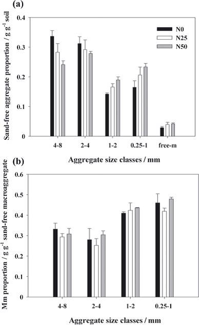 圖2施氮處理下土壤團聚體的分布規(guī)律及大團聚體包裹的微團聚體(Mm)含量變化(0 (N0), 25 (N25) and 50(N50))kg N ha?1 year?1 ).
