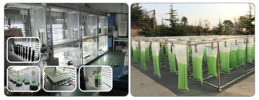 圖2. 藍(lán)細(xì)菌乙醇光合工程藻株的實(shí)驗(yàn)室培養(yǎng)和戶外規(guī)模化培養(yǎng)