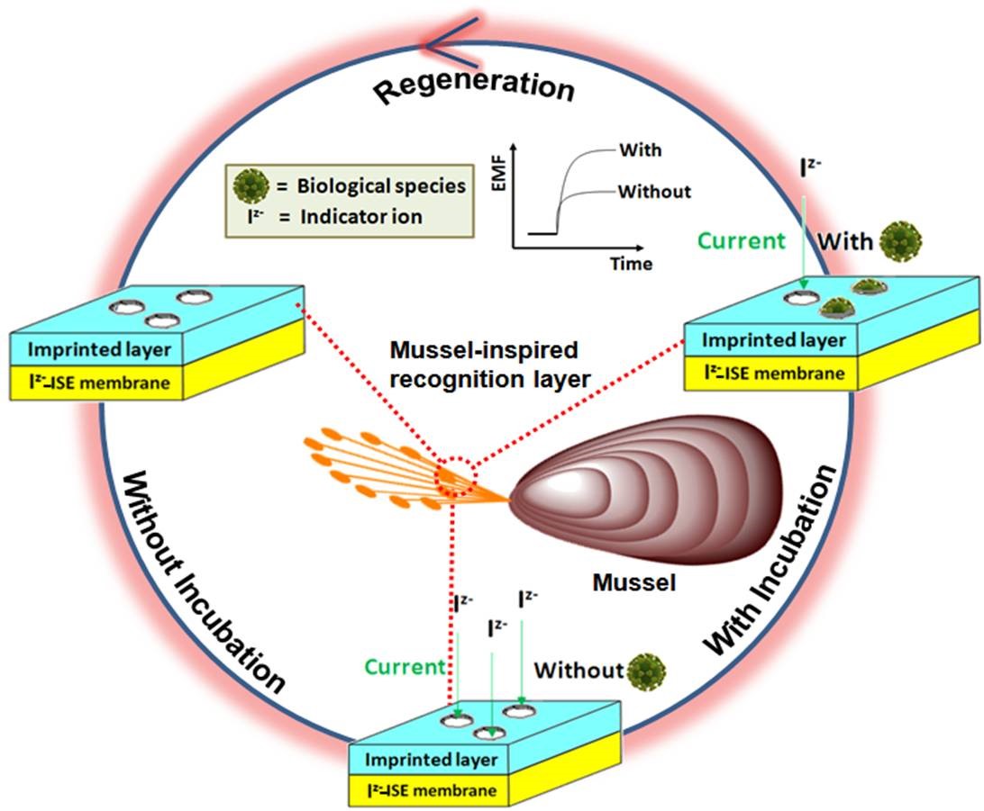 在海洋環(huán)境中,貽貝可通過其足絲分泌貽貝粘蛋白,該蛋白具有優(yōu)越的粘滯性和良好的生物相容性。近期,中國科學(xué)院煙臺海岸帶研究所秦偉研究員課題組利用聚多巴胺類仿貽貝粘蛋白材料,成功構(gòu)建了表面分子印跡聚合物電位型傳感器,實現(xiàn)了對蛋白質(zhì)分子及細(xì)胞體的高靈敏、高選擇、快速電化學(xué)檢測。他們采用基于仿貽貝粘蛋白的表面分子印跡技術(shù),在電位型傳感器表面原位構(gòu)建了生物分子選擇性識別印跡層;利用表面分子印跡層與待測生物分子之間的高選擇性識別作用,實現(xiàn)了樣品中生物分子在傳感器表面的高選擇性分離與富集;利用聚離子作為指示離子,指示富集前后傳感器膜界面的電位變化,從而實現(xiàn)了對蛋白質(zhì)分子及細(xì)胞體的免標(biāo)記電化學(xué)檢測(如下圖)。該方法有效解決了電化學(xué)生物傳感器難以實現(xiàn)免標(biāo)記分析的難題,有望應(yīng)用于海洋病毒及海洋致病菌的現(xiàn)場快速檢測中。