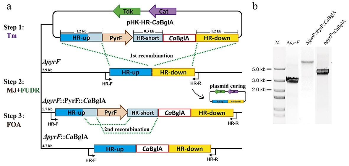 圖1. 熱纖梭菌重組菌株DSM1313::CaBglA的構建及驗證