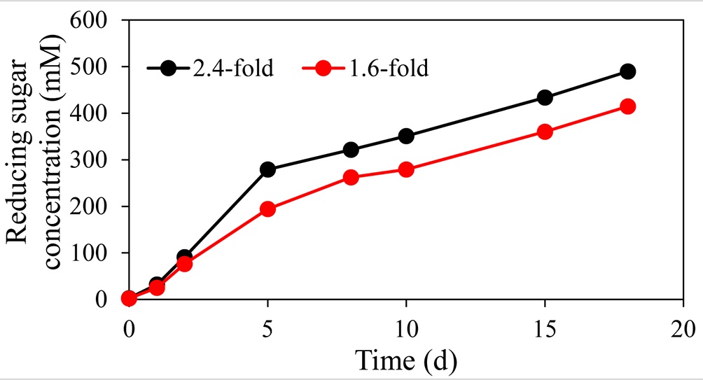 針對這一研究現狀,代謝物組學團隊對熱纖梭菌及其纖維小體進行有針對的定向改造,通過建立無疤基因組編輯系統,將源于極端嗜熱菌的 -葡萄糖苷酶CaBglA與關鍵纖維小體酶Cel48S進行融合表達并組裝到胞外纖維小體上(圖1)。利用該重組菌株作為全菌催化劑進行糖化反應發現,以100 g/L微晶纖維素為底物時,其還原糖產量達489 mM(以葡萄糖分子量換算為約88 g/L)(圖2)。該菌高效降解纖維素及生產可發酵糖的能力初步證明了木質纖維素的全菌催化糖化策略在工業化應用中的可行性。該研究拓展了木質纖維素糖化的新視野,有力推動了工業發酵領域中纖維素糖作為碳源對淀粉糖的替代。(文/圖 劉亞君)