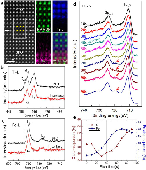 圖3、BiFeO3/PbTiO3界面的電子能量損失譜(a-c)和X射線光電子譜(d-e)分析表明,在BiFeO3/PbTiO3界面處存在氧空位聚集以及Fe3+向Fe2+的轉化。