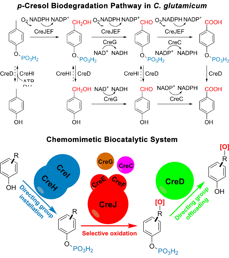 在對(duì)甲酚降解過(guò)程中,Cre生物催化系統(tǒng)所展示的磷酸基團(tuán)“裝載”(CreHI)、磷酸化中間體氧化(CreJEF、CreG和CreC)和磷酸基團(tuán)“卸載”(CreD)與化學(xué)氧化策略通常采用的基團(tuán)保護(hù)、中間體氧化和基團(tuán)去保護(hù)的整個(gè)過(guò)程不謀而合。這種“仿化”(chemomimetic)生物催化方式在自然界中極為罕見(jiàn),如能將這一策略的普適性與生物氧化的高選擇性結(jié)合起來(lái),將為“碳?xì)滏I選擇性氧化”這一世界性難題做出重要貢獻(xiàn)。
