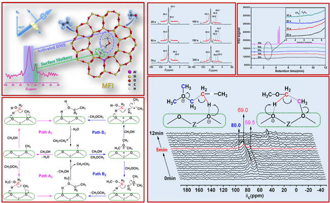 甲醇制烯烴國家工程實驗室一直堅持應(yīng)用研究與基礎(chǔ)研究并重,不但在甲醇制烯烴(MTO)過程工業(yè)化方面取得巨大成功,而且長期致力于該化學(xué)過程中的基礎(chǔ)科學(xué)問題研究。雖然MTO過程穩(wěn)態(tài)反應(yīng)階段的間接機(jī)理已形成廣泛的共識,但MTO反應(yīng)中從C1物種甲醇或者二甲醚生成第一個C-C鍵的反應(yīng)一直是C1化學(xué)中極具挑戰(zhàn)性和爭議性的課題。由于轉(zhuǎn)化發(fā)生在反應(yīng)的最初始階段,難以捕獲中間物種,一直以來所提出的反應(yīng)機(jī)理缺乏直接證據(jù)。本項工作中,研究人員通過在線監(jiān)測最初始反應(yīng)階段,推測初始烯烴來源于催化劑表面C1吸附物種的直接轉(zhuǎn)化;隨后通過催化劑液氮淬冷和固體核磁表征,確定了催化劑上最初始反應(yīng)階段存在的表面C1吸附物種(甲醇和二甲醚)和C1活性物種(表面甲氧基和三甲基氧鎓離子);進(jìn)一步通過原位固體核磁研究,在真實甲醇轉(zhuǎn)化反應(yīng)條件下,成功捕捉到二甲醚C-H鍵活化后生成的類亞甲氧基(methyleneoxy analogue)物種,由此獲取了C1物種活化生成第一個C-C鍵的直接證據(jù);在此基礎(chǔ)上提出了初始烯烴生成的反應(yīng)路徑—表面甲氧基/三甲基氧鎓離子協(xié)助甲醇/二甲醚活化轉(zhuǎn)化的協(xié)同反應(yīng)機(jī)理。這是首次在MTO反應(yīng)過程中原位觀測到C1物種的初始活化和轉(zhuǎn)化,這一發(fā)現(xiàn)將關(guān)聯(lián)甲醇初始轉(zhuǎn)化的直接機(jī)理和高效轉(zhuǎn)化階段的間接機(jī)理,建立甲醇轉(zhuǎn)化反應(yīng)完整的反應(yīng)歷程。此前在MTO反應(yīng)穩(wěn)定階段烴池(Hydrocarbon Pool)機(jī)理的研究中,研究人員曾直接捕捉到最為重要的反應(yīng)中間物種—苯基和環(huán)戊烯基碳正離子中間體,并確定了分子篩催化甲醇制烯烴的催化循環(huán)途徑(J. Am. Chem. Soc.2012,134(2),836—839;Angew. Chem. Int. Ed.2013,52(44),11564-11568)。這些工作豐富了C1催化化學(xué)的基本理論,也對MTO的工業(yè)應(yīng)用具有重要的促進(jìn)和支撐作用。