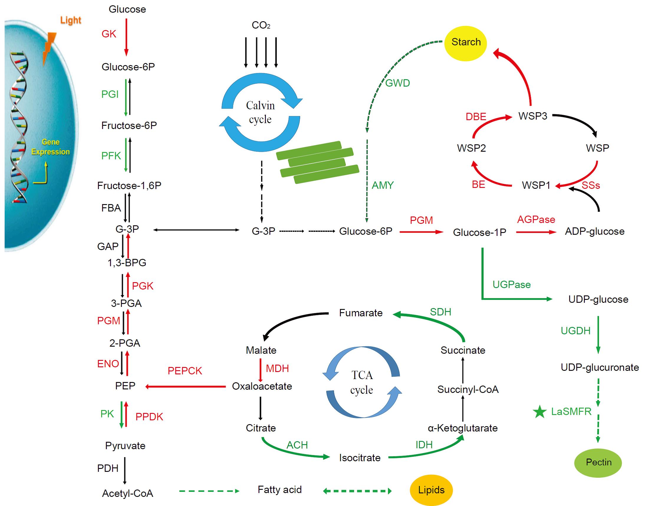 浮萍具有快速生長和高效積累淀粉的特性,因此它既是一種未來生物燃料最具有發展潛力的戰略性能源植物之一,又是一種研究植物高效積累淀粉分子機制的理想模式體系。青島能源所周功克研究團隊利用了轉錄組、代謝組及其相關酶活測定等方法,挖掘了浮萍高效積累淀粉的關鍵基因,構建了缺氮處理下浮萍淀粉高效積累的示意圖,解析了浮萍代謝流的重新分配途徑,即缺氮處理后,底物Glu-1P更易流向淀粉合成途徑,而分支途徑果膠的生物合成受阻,最終導致浮萍淀粉大量積累,從而進一步解析了浮萍淀粉高效積累的分子機制。該研究不僅為提高浮萍淀粉資源提供了理論與實踐,也為淀粉類作物改良提供理論基礎和技術支持。