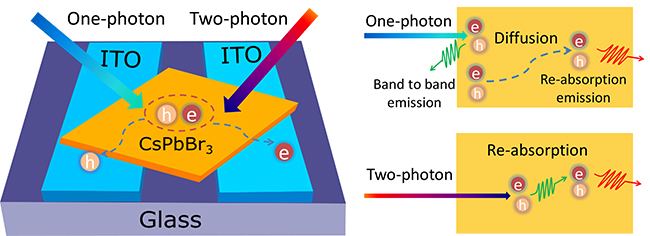 低缺陷態密度、高載流子遷移率以及有效的電荷收集是實現高性能光電探測器的重要因素。該研究團隊于2016年成功制備出有機—無機雜化鈣鈦礦微晶(ACS Appl.Mater.Interfaces2016, 8, 19587-19592)。在此基礎上采用溶液法快速合成了具有較低缺陷態密度的CsPbBr3微晶。研究其時間分辨發光光譜,發現單光子激發的熒光衰減動力學依賴其發光波長,而雙光子激發的熒光衰減動力學與發射波長無關。分析表明CsPbBr3微晶激發態載流子存在快速擴散行為,并且載流子遷移率超過100cm2V-1S-1。通過構建CsPbBr3微米尺度的光電探測器可以實現高效的電荷收集,該光電探測器具有超高的響應度(104A/W),刷新了目前有報道的全無機鈣鈦礦光電探測器的最高值,而且可以同時實現單光子和雙光響應。此外該光電探測器具有快速響應時間(1ms)。該工作為制備高性能光電探測器提供了新思路。