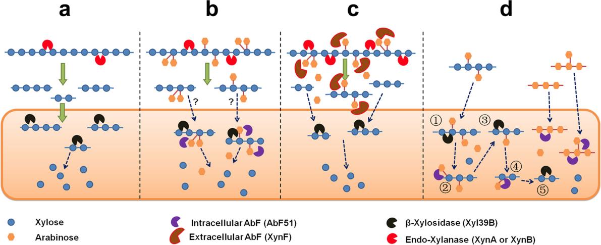 圖1 Arabinofuranosidase協同降解帶有阿拉伯糖側鏈的半纖維素模式圖