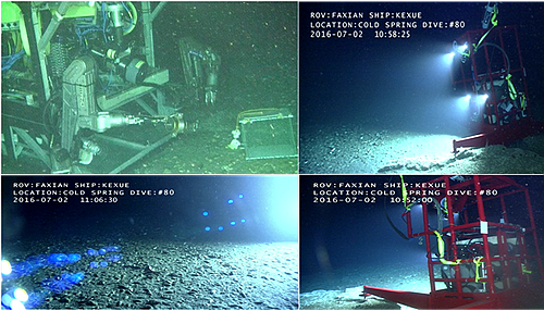 “深海多點視頻監測與化學探測長期觀測系統”于2016年9月8日零點順利布放到我國南海北部陸坡冷泉噴口(水深1130m左右)附近生物群落繁茂區,在海底連續工作長達375天后于2017年9月18日凌晨順利回收。該系統攜帶的高清影像系統成功獲取了冷泉噴口附近多點位置的生物群落生長演化的高清影像資料,利用攜帶的CTD、甲烷等傳感器同步獲取了長時間序列完整的近海底理化原位觀測參數。作為國內首套在深海連續工作超過1年的深海定點觀測系統,累計獲取了186余G的高清影像和傳感器數據資料。以上資料數據的獲取,為解析冷泉生態系統生物群落變遷、生活史演替、種群補充機制等重要基礎生物學問題及其與環境之間的合作關系提供了重要的第一手數據。同時,作為目前我國觀測時間尺度最長的化能生態系統原位定點觀測平臺,該系統及數據的成功回收也將成為回答冷泉關鍵環境參數與上層水體水動力過程、地質活動關系等科學問題的金鑰匙,提升我國深海生態系統的國際影響力。