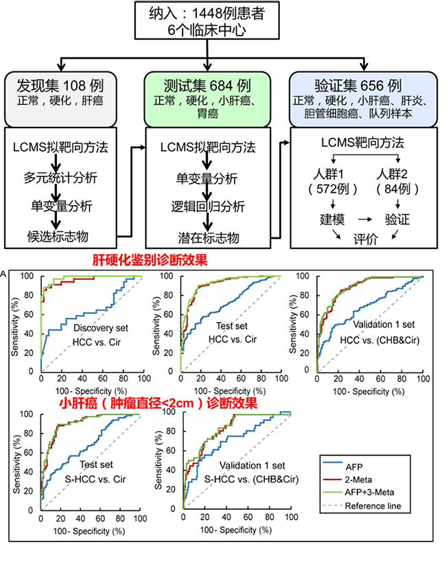 肝細胞癌(Hepatocellular carcinoma,HCC)是世界范圍內發病率位居第六、致死率居第三的惡性腫瘤,乙肝病毒感染是肝癌的主要風險因素。我國是肝癌的高發區,降低肝癌發病率、死亡率也是國家科技重大專項的重要目標之一。由于肝癌早期無明顯臨床癥狀,發展快且易轉移,臨床發現時大多已是中晚期,臨床治療效果不佳。為解決這一難題,急需發展新型、穩定可靠的方法實現肝癌的早期篩查。針對此問題,該研究團隊聯合了包括吉林大學附屬第一醫院,第二軍醫大學東方肝膽外科醫院,華中科技大學同濟醫學院,廈門大學中山醫院,北京大學人民醫院,山東省立醫院等6家臨床相關研究機構,納入了1448例受試者,受試者中包括健康對照、慢性乙肝肝炎、肝硬化和肝癌等。該研究采用了大連化物所自主開發的基于LC-MS的大規模代謝組分析技術,鑒定和驗證了一組新型的肝癌組合代謝標志物:甘氨酸膽酸、苯丙酰色氨酸。大規模臨床驗證結果顯示,該組合標志物能夠有效的在高風險的肝硬化患者人群中發現肝癌患者,其受試者操作特征曲線下面積(AUC)達到0.807-0.930,優于傳統的肝癌臨床標志物甲胎蛋白(AFP)的0.65-0.725,同時與AFP具有較好的互補性。二者聯合應用可有效避免AFP陰性肝癌患者的漏診,聯合應用的診斷正確率可達80.6%-100%。