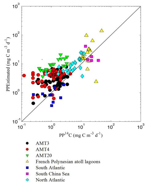 圖2 超微型浮游植物模型估測固碳量與基于14C原位實測固碳量之間的關系