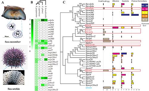 海參屬于棘皮動物,是其中體型與形態(tài)最為特殊的種類,且處于從無脊椎向脊椎動物分化的獨特進化地位,也是國內(nèi)外重要的海產(chǎn)經(jīng)濟物種,具有極高的營養(yǎng)與醫(yī)用價值。在該研究中,研究人員利用Illumina和Pacbio測序平臺和優(yōu)化的組裝策略,構(gòu)建了海參全基因組的精細圖譜,Contig N50 達到190 KB, Scaffold N50 達到486 KB,編碼30350個基因。分析發(fā)現(xiàn)了調(diào)控動物關(guān)鍵進化過程中脊索形成的關(guān)鍵轉(zhuǎn)錄因子Brachyury基因的FGF基因在棘皮動物中顯著收縮為1個,提示了棘皮動物在長期的進化過程中脊索、咽鰓裂消失的潛在原因。海參的近親--海膽具有顯著、發(fā)達的外骨骼,而海參外觀柔軟,骨骼退化為細小的桌形體,基因組解析發(fā)現(xiàn)它們都具有相對完整的骨骼發(fā)育通路,而不同之處在于海膽的礦化基因為31個,海參縮減為7個,而且海參礦化基因在發(fā)育過程中低表達,這才是其骨骼顯著退化的根本原因。
