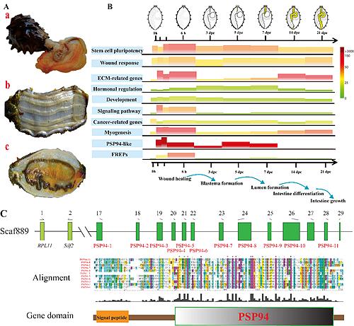 強大的再生潛能是棘皮動物最顯著的特征之一,該研究利用多組學方法揭示了海參超強再生能力的分子機制。該種海參在強烈環(huán)境脅迫下可以將體內(nèi)內(nèi)臟幾乎全部排出體外,當環(huán)境適宜后,可在2-3周重新長出功能完善的內(nèi)臟器官。研究揭示了海參再生特有的由11個基因串聯(lián)重復組成的PSP94-like基因簇和顯著擴張成簇的fibrinogen-related protein (FREP)基因是海參具有超強再生能力的根本原因之一。