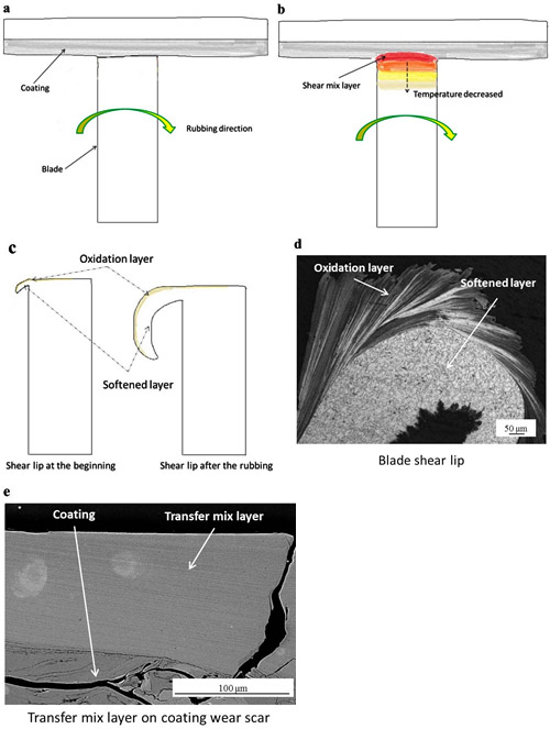 圖 GH4169葉片高速刮擦中形成剪切唇的過程(a,b,c),典型剪切唇結構(d)和對摩封嚴涂層中形成的轉移層(e)