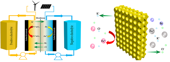 大規模儲能技術是實現可再生能源普及應用的關鍵核心技術,液流電池由于具有安全性高、儲能規模大、效率高、壽命長等特點,在大規模儲能領域具有很好的應用前景。全釩液流電池是目前發展最為成熟的液流電池技術之一,現處于產業化示范階段。但該電池仍存在能量密度較低,成本較高的問題。為此,研究團隊選擇成本較低的FeCl2和ZnBr2作為活性物質,構建了中性液流電池體系。采用絡合技術解決了中性條件下鐵的水解問題,利用多孔離子傳導膜替代傳統離子交換膜解決了由于鐵離子污染導致膜內阻升高的問題,并提高了中性介質中離子在膜中的傳導性,大大提高了中性鋅鐵液流電池的性能和穩定性。該電池在40mA/cm2工作電流密度條件下,能量效率超過86%,連續運行超過100次循環性能無明顯衰減。該體系活性物質濃度可達2M,其體積能量密度可達56Wh/L。更重要的是,與其他液流電池體系相比,該體系具有更低的成本(<400RMB/kWh),表現出很好的應用前景。該工作對于新一代液流電池的研究開發,具有重要的指導意義。