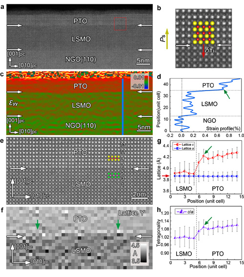 圖1、3.6nm PbTiO3/La0.7Sr0.3MnO3薄膜界面處的晶格參數和應變分析。顯示出PbTiO3/La0.7Sr0.3MnO3薄膜界面處面外晶格常數(g)以及四方性(h)顯著增加。