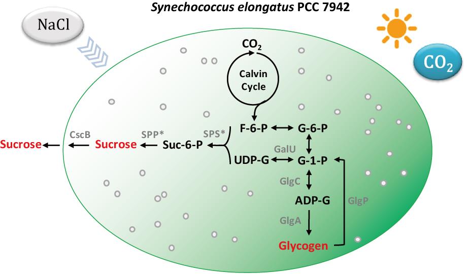 此外,該團(tuán)隊(duì)在藍(lán)細(xì)菌蔗糖合成代謝機(jī)理研究中也取得新進(jìn)展(Qiao et al., Appl Environ Microbiol, doi: 10.1128/AEM.02023-17)。在藍(lán)細(xì)菌中,由于蔗糖合成與糖原合成使用相同的前體物——葡萄糖-1-磷酸,因此一般認(rèn)為二者之間存在合成競爭關(guān)系,抑制糖原合成將能促進(jìn)蔗糖合成。然而,該研究團(tuán)隊(duì)的研究結(jié)果表明情況并非如此。該團(tuán)隊(duì)利用核糖體開關(guān)策略,實(shí)現(xiàn)了對聚球藻PCC 7942工程菌株中糖原合成的梯度抑制,發(fā)現(xiàn)糖原水平的下降并沒有帶來蔗糖合成水平的提升,反而降低了蔗糖產(chǎn)量;而在藍(lán)細(xì)菌中增強(qiáng)糖原合成,則有效提高了蔗糖合成水平。該結(jié)果表明糖原合成并非是藍(lán)細(xì)菌蔗糖合成的競爭性途徑,其更有可能作為一個(gè)“碳庫”為蔗糖合成提供碳素支持(圖1)。該研究結(jié)果改變了業(yè)界對藍(lán)細(xì)菌中糖原合成與蔗糖合成關(guān)系的傳統(tǒng)認(rèn)識,同時(shí)也為進(jìn)一步提高基因工程藍(lán)細(xì)菌蔗糖產(chǎn)量提供了新的改造策略。