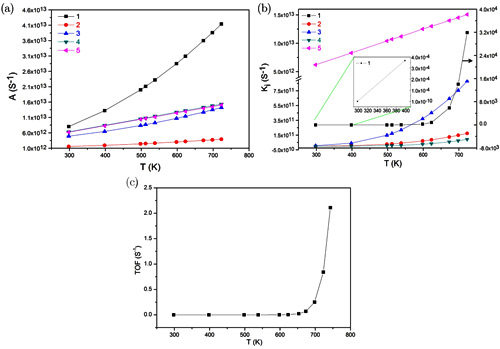 圖3.通過微觀反應(yīng)動力學(xué)計算得到的乙烷氧化脫氫反應(yīng)動力學(xué)參數(shù)。(a)指前因子 (b)反應(yīng)平衡常數(shù) (c) 反應(yīng)轉(zhuǎn)化頻率