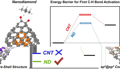 納米金剛石在烷烴直接脫氫反應(yīng)中表現(xiàn)出優(yōu)異的催化效果,不僅僅超過傳統(tǒng)金屬催化劑,而且相對于其他納米碳材料催化劑例如碳納米管也具有更好的穩(wěn)定性和選擇性。通過第一性原理計算,研究人員從催化劑結(jié)構(gòu)、碳?xì)滏I活化能壘、電荷轉(zhuǎn)移以及尺寸效應(yīng)等幾個方面揭示了納米金剛石獨特的sp2@sp3核殼結(jié)構(gòu)與催化性能之間的構(gòu)效關(guān)系,為進(jìn)一步設(shè)計和優(yōu)化非金屬納米碳材料催化劑提供了理論支持(ACS Catalysis 2017, 7, 3779-3785.)。
