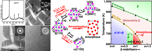 在研究直接凝固(Ti0.615Zr0.385)100-3.9x(Cu2.3Fe1.6)x (x=1)合金的相變過程中,研究人員發現亞穩b相晶粒內部分布著具有特定取向的柳葉狀或者板條狀非晶相(見圖),非晶相和b相基體無明顯成分差別,并且在界面處存在明顯的切變臺階以及嚴重的b相晶格畸變。這種非晶相的形態與已報道的固態非晶化明顯不同。提出了一種“馬氏體相變致非晶化”機制:亞穩b型(Ti0.615Zr0.385)100-3.9x(Cu2.3Fe1.6)x (x=1)合金在冷卻過程中,高溫穩定的體心立方結構變得不再穩定,出現兩種聲子軟化模式:T1 1/2 (1,1,0)和L 2/3 (1,1,1)。前者導致b相轉變為a /a 馬氏體,后者導致晶面{222}b部分移位形成w相。而對于特定成分的b鈦合金,馬氏體相變過程中的局域晶格切變和畸變使得結構無序的非晶相相對于晶態a /a /w相更容易形成,導致馬氏體非晶化的出現(見圖)。這種非晶相可被稱為“非晶馬氏體”。這一發現豐富了固態非晶化機制和馬氏體相變理論。