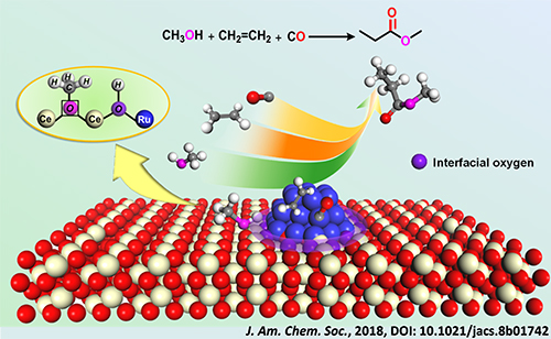 近日,中國科學院大連化學物理研究所研究員王峰團隊在二氧化鈰界面酸堿催化的研究中取得新進展。該研究發現在部分氧化的釕簇與二氧化鈰界面處,存在由氧空位與界面氧(Ru-O-Ce)構成的路易斯酸-堿對(Interfacial Lewis Acid-Base Pair),證實了界面氧為氫傳遞跳板,提供適宜的質子,從而實現了在無酸添加條件下,以乙烯、甲醇和CO等低碳分子為原料,一步高效催化轉化生成新的C-C和C-O鍵,制備重要含氧化合物丙酸甲酯。相關研究結果發表在《美國化學會志》(J. Am. Chem. Soc.)上。