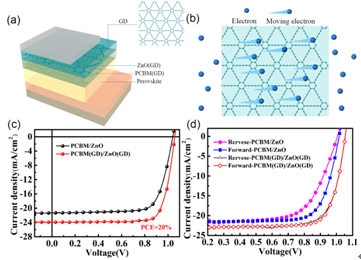 圖1. (a)鈣鈦礦太陽能電池器件結(jié)構(gòu)示意圖;(b) 石墨炔化學(xué)結(jié)構(gòu)及其電子傳輸示意圖;(c) 鈣鈦礦太陽能電池電流-電壓曲線;(d) 電池在不同掃描方向的器件行為。