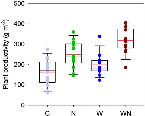 圖1. 添加氮(N)、水(W)對溫帶典型草地植物生產力的影響