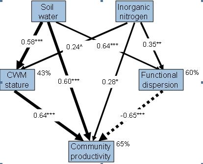 圖2. 土壤氮、水有效性直接或通過影響植物功能多樣性(CWM stature, functional dispersion)間接驅動溫帶典型草地植物生產力