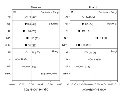 已有研究發現氮沉降對植物的生產力的影響與植物多樣性的變化有顯著關系,那么氮沉降對微生物生物量的影響是否與微生物多樣性的改變有關系呢?基于此,中國科學院沈陽應用生態研究所生物地球化學組王超博士及其合作者,通過整理全球198個施氮模擬實驗樣點的土壤微生物多樣性數據,包括171個Shannon指數和102個Chao1指數,分析氮添加后細菌和真菌多樣性的變化及與微生物生物量變化的關系,結果發現:1)氮增加顯著降低了細菌和真菌的Shannon和Chao1指數;2)氮增加顯著降低了酸桿菌門(Acidobacteria)和硝化螺旋菌門(Nitrospirae)微生物的相對多樣性;3)氮增加情況下,土壤微生物生物量的降低與多樣性的降低呈現顯著正相關性;4)氮增加情況下,土壤養分變化而非pH值的變化是影響微生物多樣性變化的主要因素。本研究揭示了氮沉降增加使得微生物生物量降低的根本原因,為全面理解氮沉降對陸地植物-土壤-微生物間養分循環及生態系統功能提供有力的理論支持。