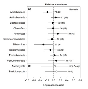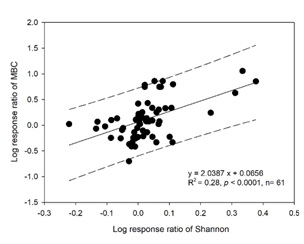 圖3. 氮增加對土壤微生物多樣性的改變與微生物生物量改變的關系