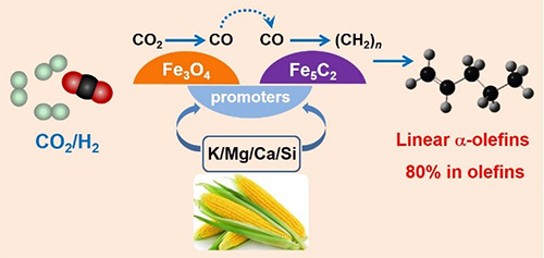 近日,中國科學院大連化學物理研究所碳資源小分子與氫能利用創新特區研究組孫劍和葛慶杰研究團隊在CO2催化轉化領域取得新進展,通過設計一種多助劑共存的鐵基催化劑,實現了CO2加氫高選擇性制取線性a-烯烴。該工作發表在《自然》(Nature)出版集團新刊《通訊-化學》(Communications Chemistry)雜志上。