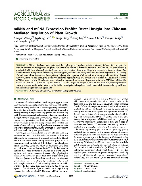 論文引用:Xiaoqian Zhang, Kecheng Li, Ronge Xing, Song Liu, Xiaolin Chen, Haoyue Yang, Pengcheng Li*. miRNA and mRNA expression profiles reveal insight into the chitosan-mediated regulation of plant growth. Journal of agricultural and food chemistry, 2018, 66(15): 3810-3822
