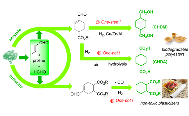 該研究團(tuán)隊(duì)前期發(fā)展了以木質(zhì)纖維素為原料的生物質(zhì)路線合成聚酰亞胺單體均苯四甲酸(Green Chem.)。在此基礎(chǔ)上,本工作以生物質(zhì)平臺(tái)化合物(可從生物質(zhì)獲得的)甲醛、巴豆醛和丙烯酸酯/富馬酸酯為原料,發(fā)展了脯氨酸催化的三組分環(huán)加成反應(yīng),然后通過(guò)調(diào)節(jié)后續(xù)過(guò)程,分別選擇性合成CHDM、CHDA和1,2-環(huán)己烷二甲酸酯,兩步總收率均可達(dá)到70%以上。通過(guò)生命周期評(píng)價(jià)(LCA)方法對(duì)比生物質(zhì)路線和石油路線,結(jié)果表明在生產(chǎn)CHDM和1,2-環(huán)己烷二甲酸酯方面,生物質(zhì)路線具有更低的碳排放;在生產(chǎn)CHDA方面,通過(guò)酸催化水解的方式,也可以獲得更低的碳排放,生物質(zhì)路線展現(xiàn)出了積極的碳減排潛力。