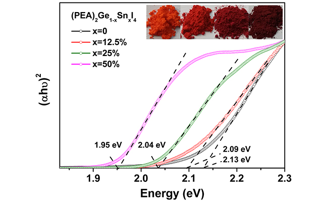 該研究團(tuán)隊(duì)前期合成了一種二維鍺基鈣鈦礦材料(J. Phys. Chem. Lett.)。本工作以該材料為主體,向其中加入適量的錫元素(Sn),形成一系列二維鍺錫混合鈣鈦礦材料——(PEA)2Ge1-xSnxI4。研究發(fā)現(xiàn),加入的Sn元素可以有效減小二維鍺基鈣鈦礦材料的帶隙,當(dāng)材料中Sn和Ge的比例為1:1時,其具有最小的帶隙,進(jìn)而可以有效增強(qiáng)材料的光吸收能力,有利于提高對太陽光的利用率。同時,相應(yīng)的理論計(jì)算也證實(shí)了加入的Sn元素可以減小材料的帶隙值。此外,在二維鍺基鈣鈦礦中摻入錫可以提高其導(dǎo)電性,這為改善光伏材料的性能提供了一種可行方法。
