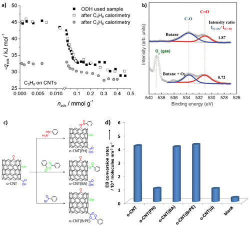 對碳材料催化活性中心的定性和定量是催化反應動力學和機理研究的基礎和關鍵。近反應條件下的分子吸附熱和原位XPS表征結果均表明碳材料表面親核性較高的氧物種對催化烷烴氧化脫氫反應貢獻顯著。齊偉研究團隊提出的原位化學滴定方法在領域內首次給出直接的化學證據證明酮羰基基團是納米碳催化烷烴氧化脫氫反應的活性中心(Angew. Chem. Int. Ed. 2013, 52, 14224)。同時,該方法能夠通過單次測試直接定量活性中心數目,獲得碳材料歸一到單個活性中心的本征催化活性(TOF),為反應動力學研究打下基礎(Angew. Chem. Int. Ed. 2015, 54, 13682)。